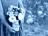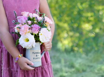 girl hands holds beautiful floral bouquet in vase, abstract blurred natural background. romantic floral gift, festive image. copy space. template for design