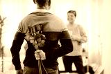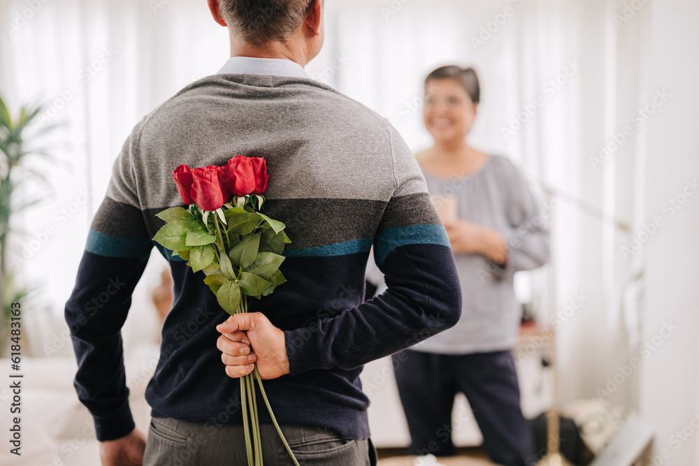 senior adult couple lover cute gentle man surprise giving roses flower for wedding anniversary or valentine days to his wife at home