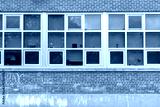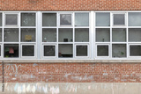 Facade of an old red brick public school building brick walls, chalk marks, white-paned windows, nobody