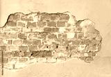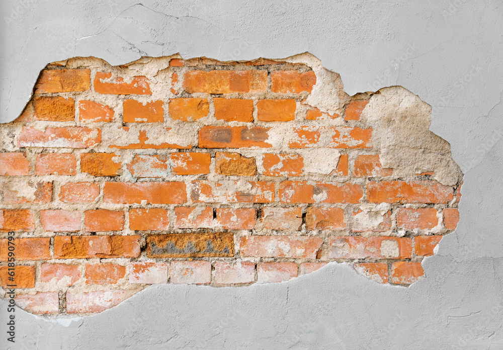 Background of brick wall texture. Crumbling cement plaster in the center. Text space. Close-up.