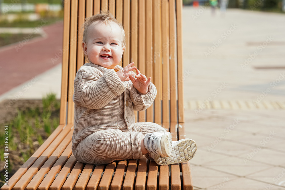 Cute baby sitting on a wooden bench in the park