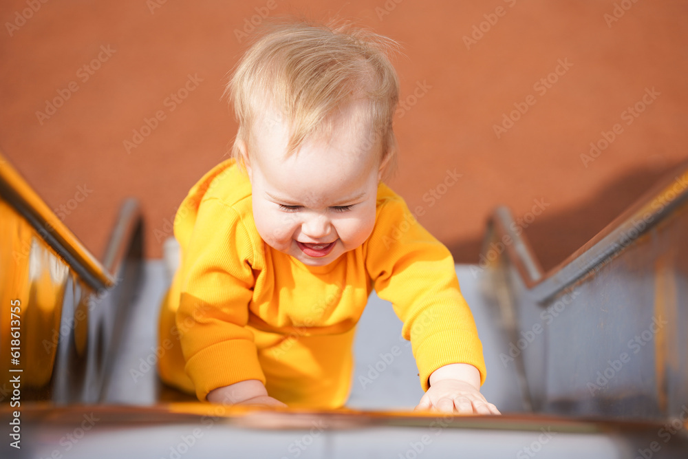 Cheerful baby toddler plays on the playground in the summer
