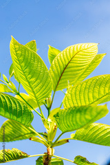 Leaf of Mitragyna speciosa is on the tree for science research. Kratom leaf. Leaves of the cottage grow on the branches,Growing green cottage leaf outstanding and beautiful