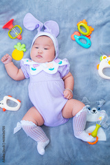 baby boy in bunny costume,Cute baby Easter bunny. Little baby boy with bunny ears and Easter eggs in wicker basket in white fur. Symbol of Easter holiday, birth, spring, religion.