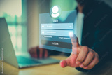 Businessman use laptop login username and password identity or sign up register concepts of cyber security, internet access, join social or personal data protection or forget pass key unlock.
