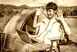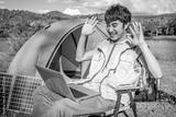 Young travel man relax and enjoy talking calling on video on laptop, using laptop computer work remotely anywhere using internet connected to portable solar panel charging