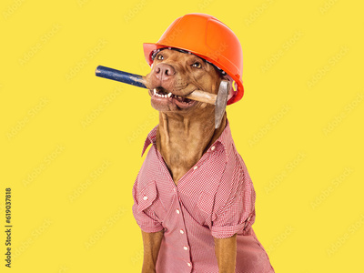 Cute brown dog, safety helmet and hammer. Close-up, indoors. Studio shot. Congratulations for family, relatives, loved ones, friends and colleagues. Pets care concept