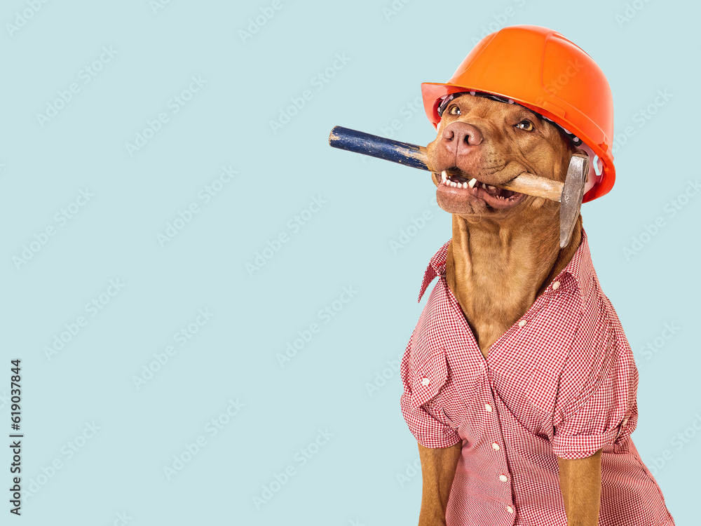 Cute brown dog, safety helmet and hammer. Close-up, indoors. Studio shot. Congratulations for family, relatives, loved ones, friends and colleagues. Pets care concept