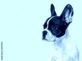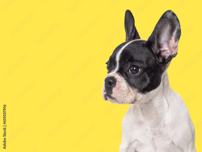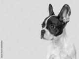 Cute puppy sitting on the table. Studio shot. Isolated background. Clear, sunny day. Close-up, indoors. Day light. Concept of care, education, obedience training and raising pets