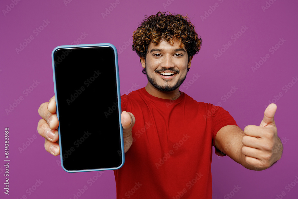 Young Indian man he wear red t-shirt casual clothes hold in hand use close up mobile cell phone with blank screen workspace area show thumb up isolated on plain purple background. Lifestyle concept.