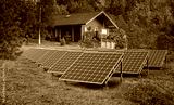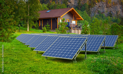 House with solar panels. Cottage among trees. Housing in eco clean place. Solar panels on lawn. Eco villa with electric generators. Concept selling solar panels. Country house at nature