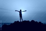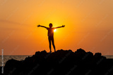Silhouette little cute girl show hand up feel relaxing and happiness on holidays on above of stone at sea with orange sun sky background.