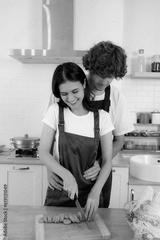 Happy couple preparing together yummy lunch Man and girl standing in kitchen at home on first dating Spouses enjoy warm conversation and cooking process Carie for health eating fresh vegetable salad