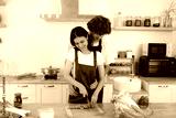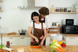 Happy couple preparing together yummy lunch Man and girl standing in kitchen at home on first dating Spouses enjoy warm conversation and cooking process Carie for health eating fresh vegetable salad