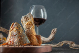 front view dried sliced fish with glass of wine on dark background seafood vobla sea ocean color meat fish