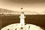 Alanya lighthouse aerial drone view with port and city. Alanya, Turkey
