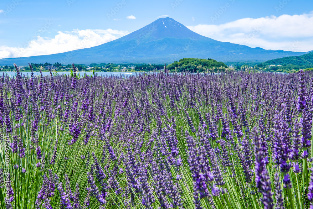 山梨県河口湖と湖畔のラベンダー畑と富士山