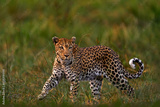 Wildlife nature, Botswana wildlife. Leopard in green nice orange grass. Leopard walk. Big wild cat in the nature habitat, sunny day on the savannah, Khwai river.
