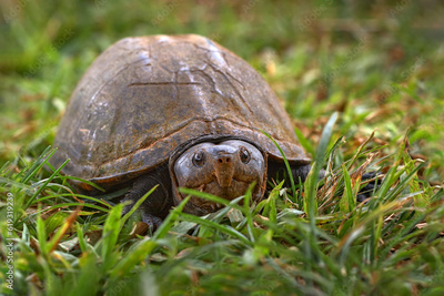 Scorpion mud turtle, Kinosternon scorpioides, turtle in the green grass near the water. Cano Negro Reserve in Costa Rica. Tabasco mud turtle in the nature habitat. Costa Rica wildlife.