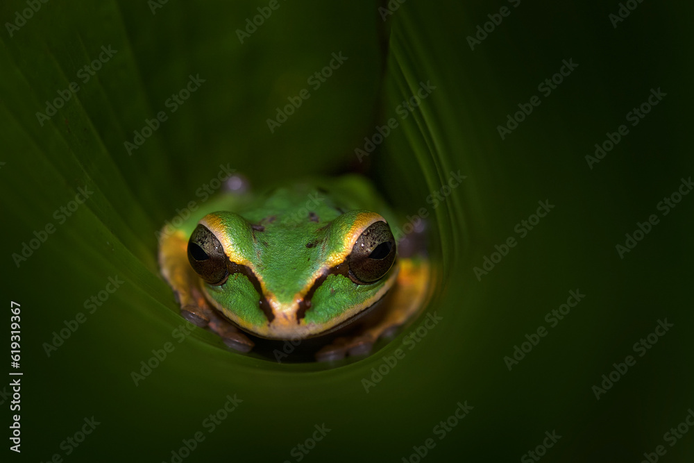 Costa Rica wildlife. Beautiful animal in tropical forest. Masked Smilisca, Smilisca phaeota, exotic tropical green frog from Costa Rica, close-up portrait.