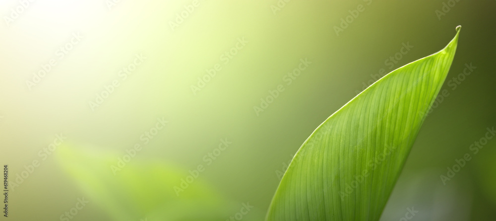 Panoramic nature green leaf in garden at summer. Natural green leaves plants using as spring background cover page greenery environment ecology wallpaper.