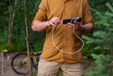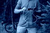 A tourist charges a smartphone with a power bank on the background of a bicycle in forest.