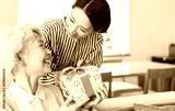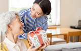 プレゼントを渡す女性/プレゼントを受け取るシニア女性