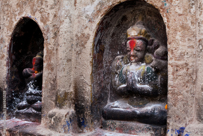 close up of sculpture of Buddha in Boudhanath stupa, Kathmandu, Nepal