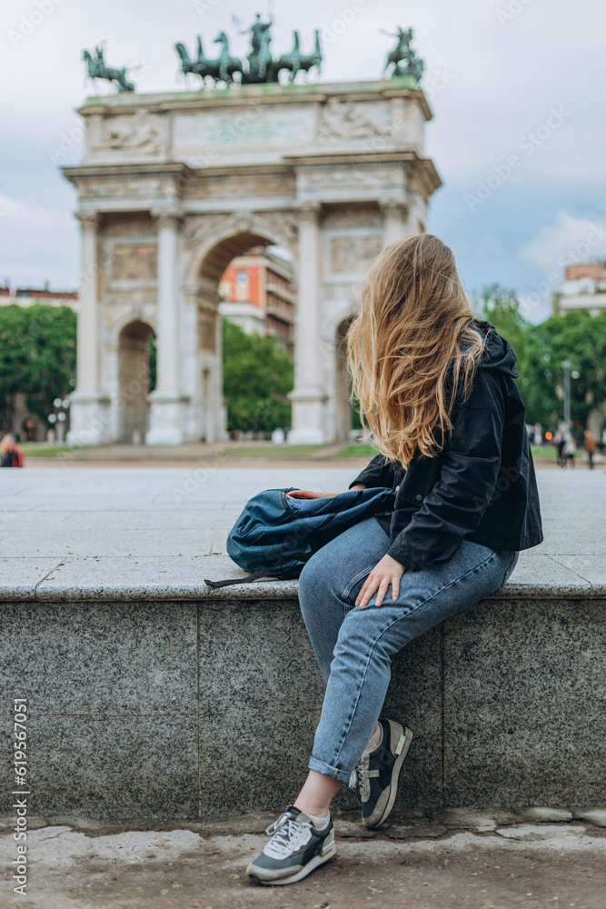 Milan, Italy- May 13, 2023: Girl sits near Arch of Peace or Sempione Gate in Milan, near Sempione Park. Exterior view of the marble gate of the Arco della Sempione, a peace memorial in Milan.