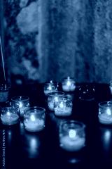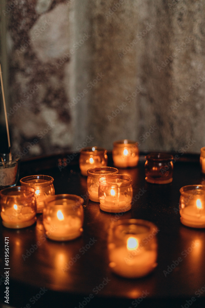 Picture of Easter candles burning at night with golden light of candle flame. Lampion candles glowing in a dark church. Emotional mood. Many burning candles with shallow depth of field.