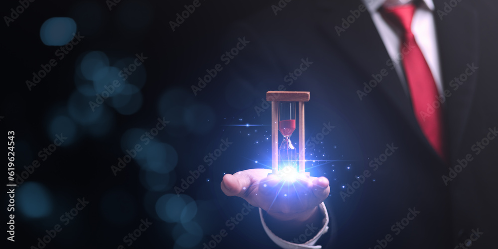 hourglass on businessman hand, time management concept ,effective business planning ,time management organization ,Agreement and solution ,end of deal ,profitable use of time ,appointment punctuality