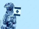 Cute brown dog, military shirt and Canadian Flag. Closeup, indoors. Studio shot. Congratulations for family, loved ones, relatives, friends and colleagues. Pets care concept