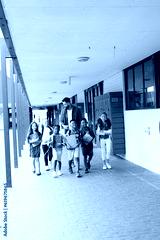 Vertical of diverse, happy male teacher and elementary schoolchildren in school corridor, copy space