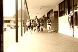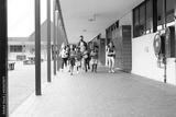 Diverse male teacher with happy children running in elementary school corridor, copy space