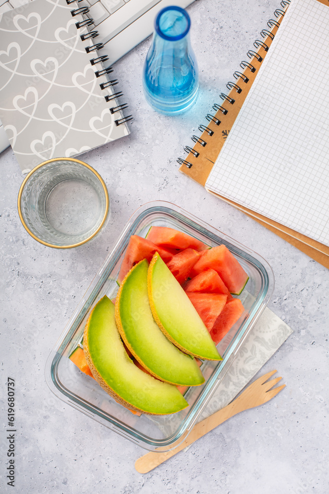 Healthy snack at office workplace, organic vegan meals from take away lunch box