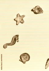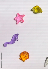 Marine transparent colorful figurines or kid's toys on the white striped background. Summer sea vacation concept frame. Copy space