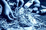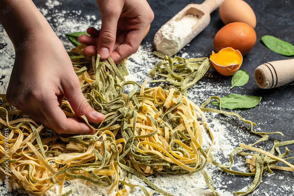 Raw italian pasta. Dry noodles with spinach, process of making cooking homemade pasta
