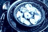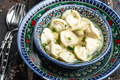 chuchvara dumplings with meat. Delicious uzbek dumplings. Manti with lamb meat. Uzbek cuisine, place for text, top view