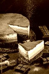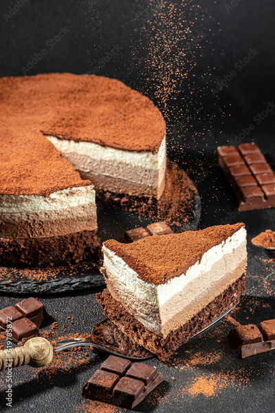 slice of tasty homemade three chocolate cake on a dark background, place for text