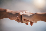 Man, hands and fist bump for teamwork, partnership or unity in solidarity or community in the outdoors. Hand of friends bumping fists together for team goals, support or motivation in collaboration
