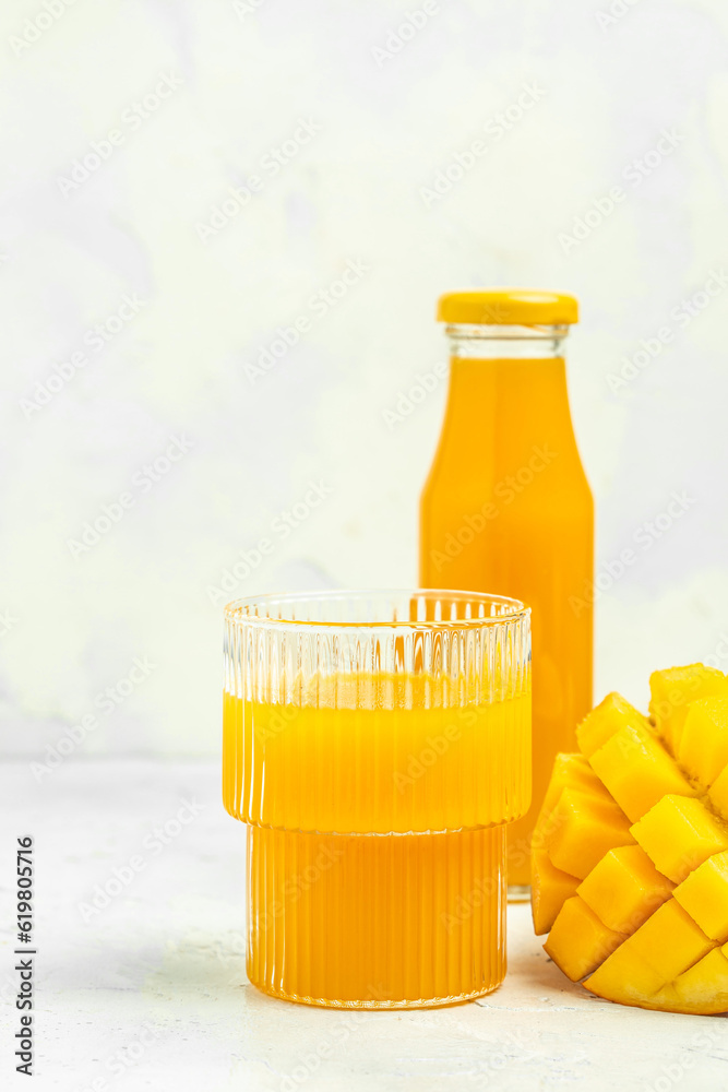 Tasty mango drink and fresh fruits on a light background. vertical image. top view. place for text