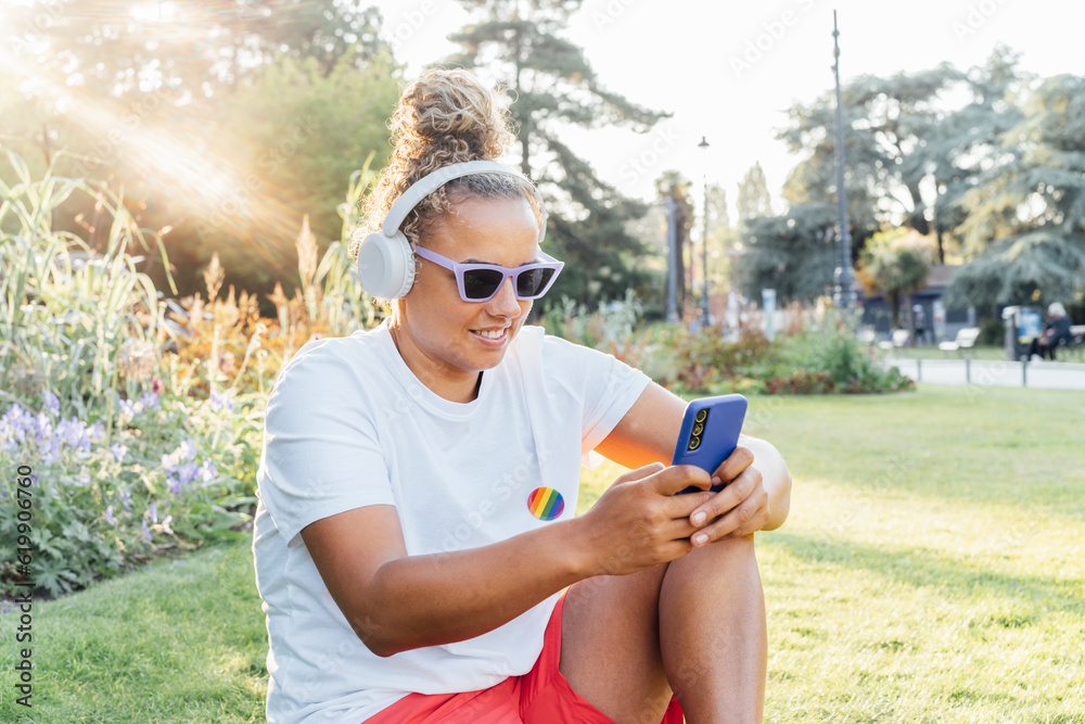 Young smiling lesbian lgbtq woman using mobile phone at park, having video chat with friends, doing online shopping, creating content for followers. Social Diversity acceptance, feel free lifestyle.