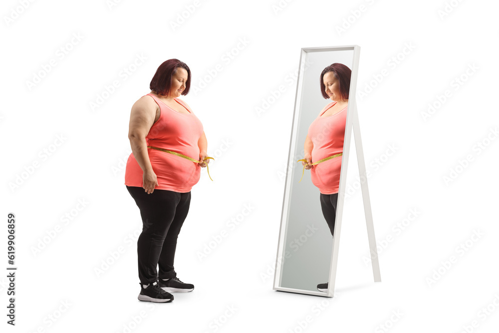 Overweight woman in front of a mirror measuring her waist