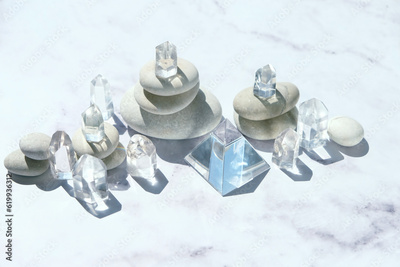 clear quartz minerals and grey pebble zen stones on abstract marble background. set of gemstones for healing Crystal Ritual, esoteric spiritual practice. Witchcraft. relax, meditation, life balance