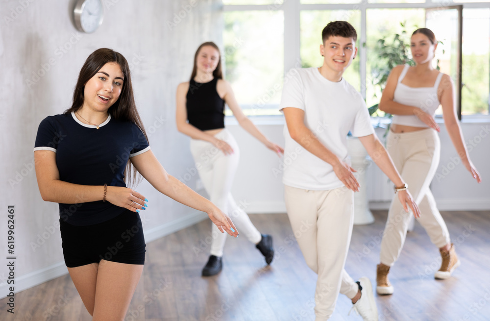 Nice girls and guys dancing synchronous group choreography in dance hall