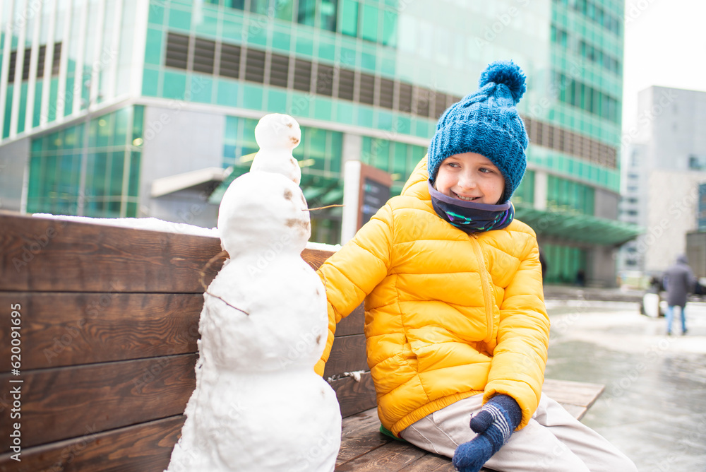 a happy smiling boy made a little snowman on a bench in the center of a metropolis, a winter city