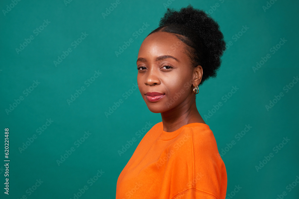 Beautiful Black woman, studio teal background, fashion lifestyle portrait