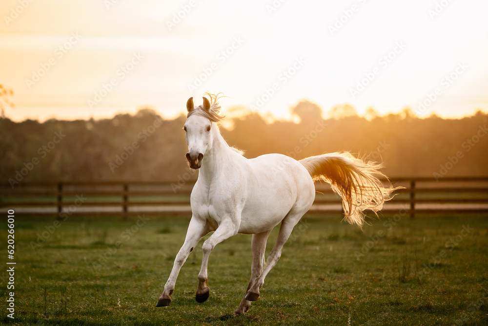 Arabian horse cantering in a pasture.