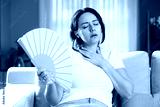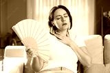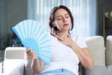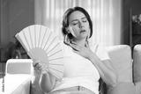 Stressed young woman waving fan suffer from overheating sit on couch at home