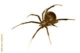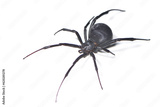Closeup of the medically important black-widow spider Latrodectus dahli (Araneae: Theridiidae), a black velvet arachnid distributed in Asia, Europe and Africa, photographed on white background.